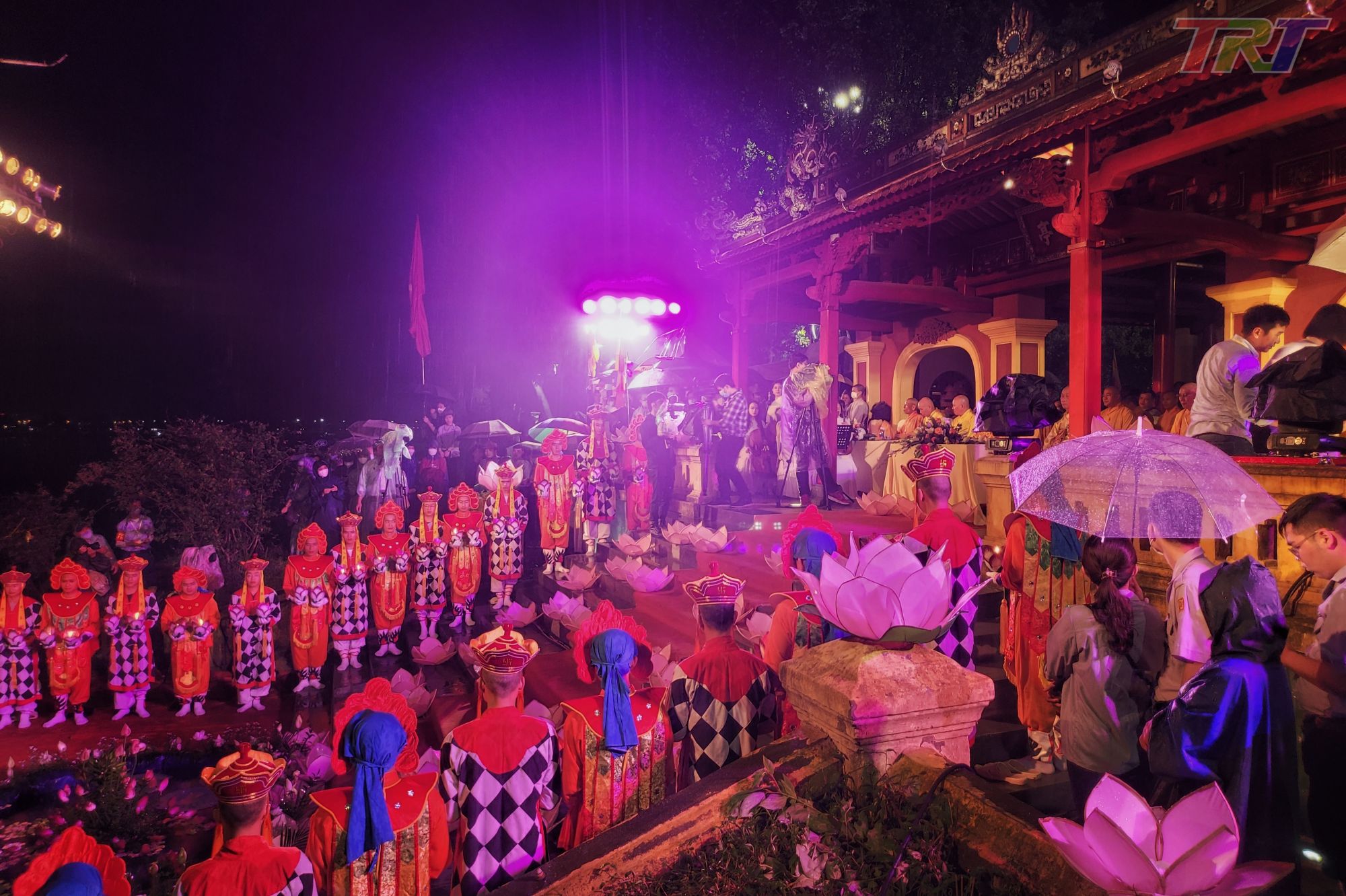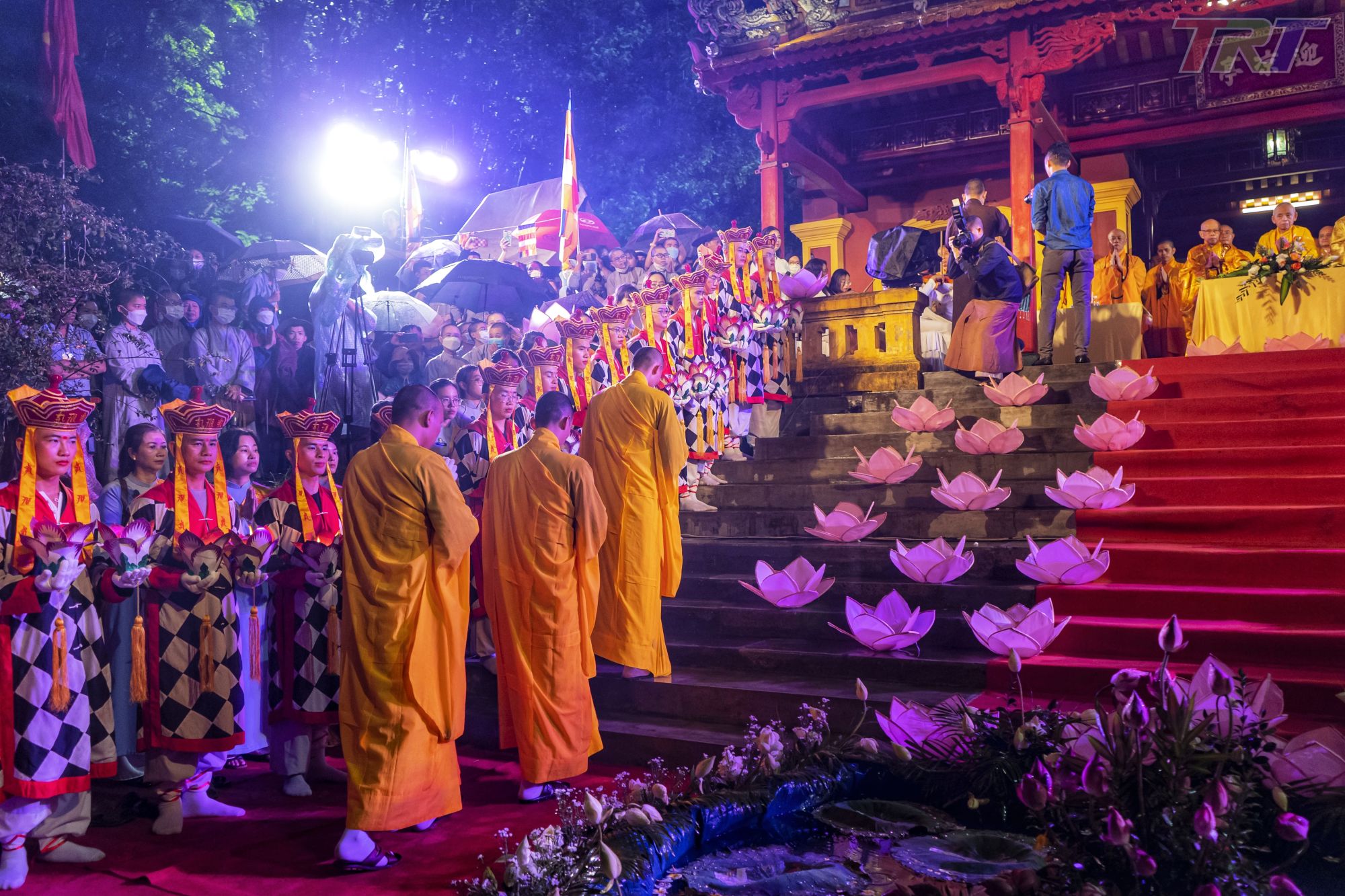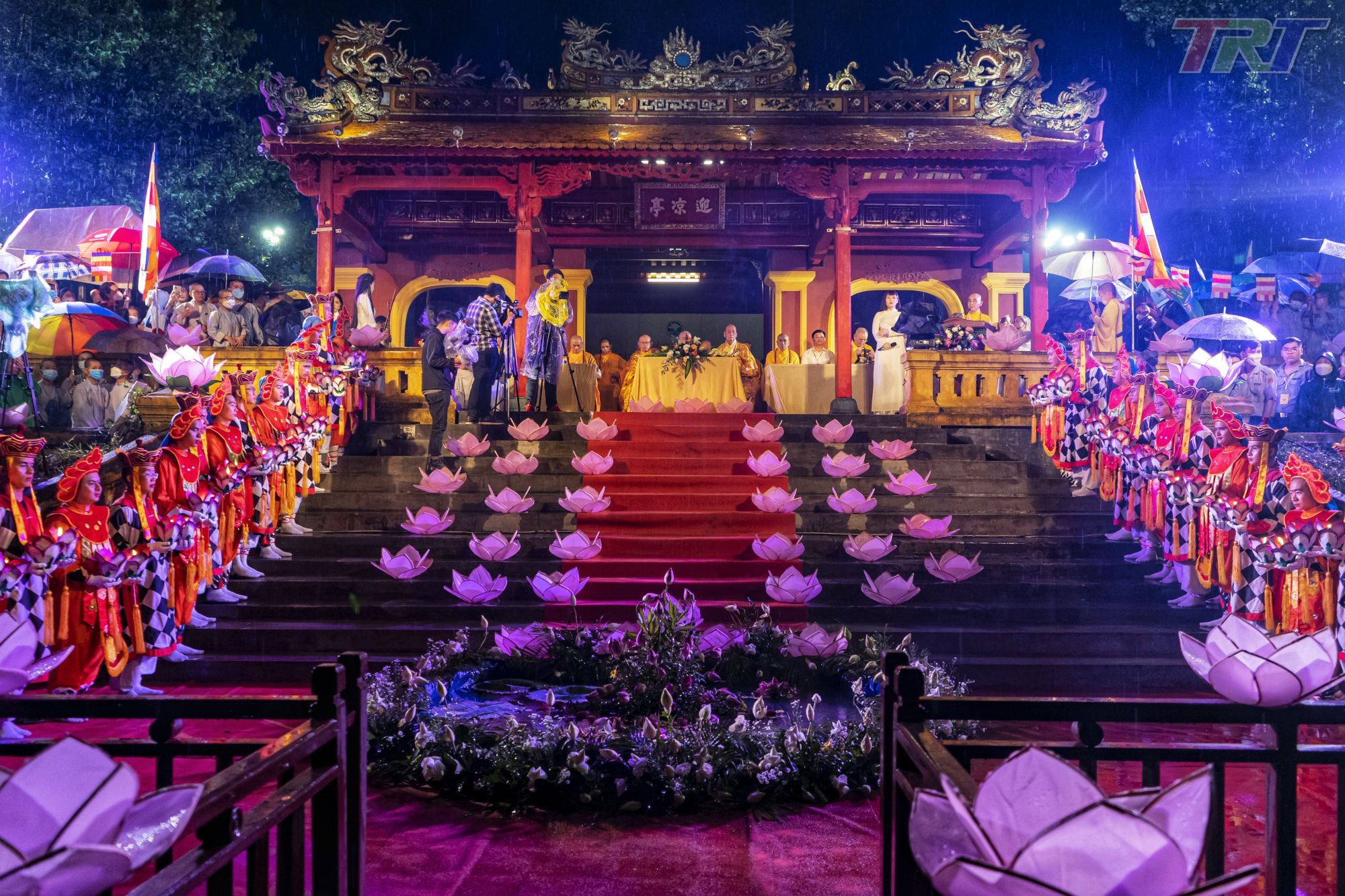 Buổi lễ diễn ra trong bầu không khí trang nghiêm, xung quanh Nghinh Lương Đình, các tăng ni, Phật tử chắp tay cầu nguyện; ở phía dưới sông Hương, các đài sen đã được neo cố định chờ được thắp sáng.