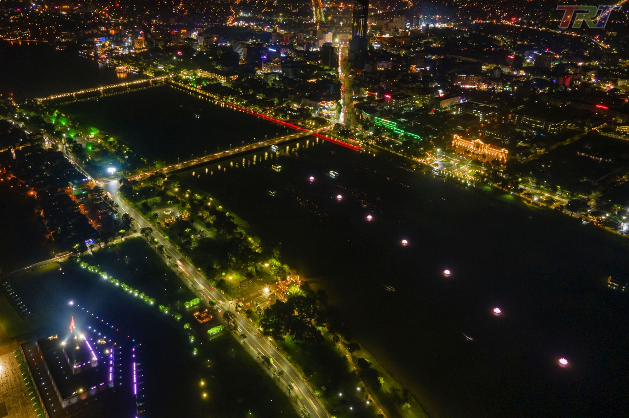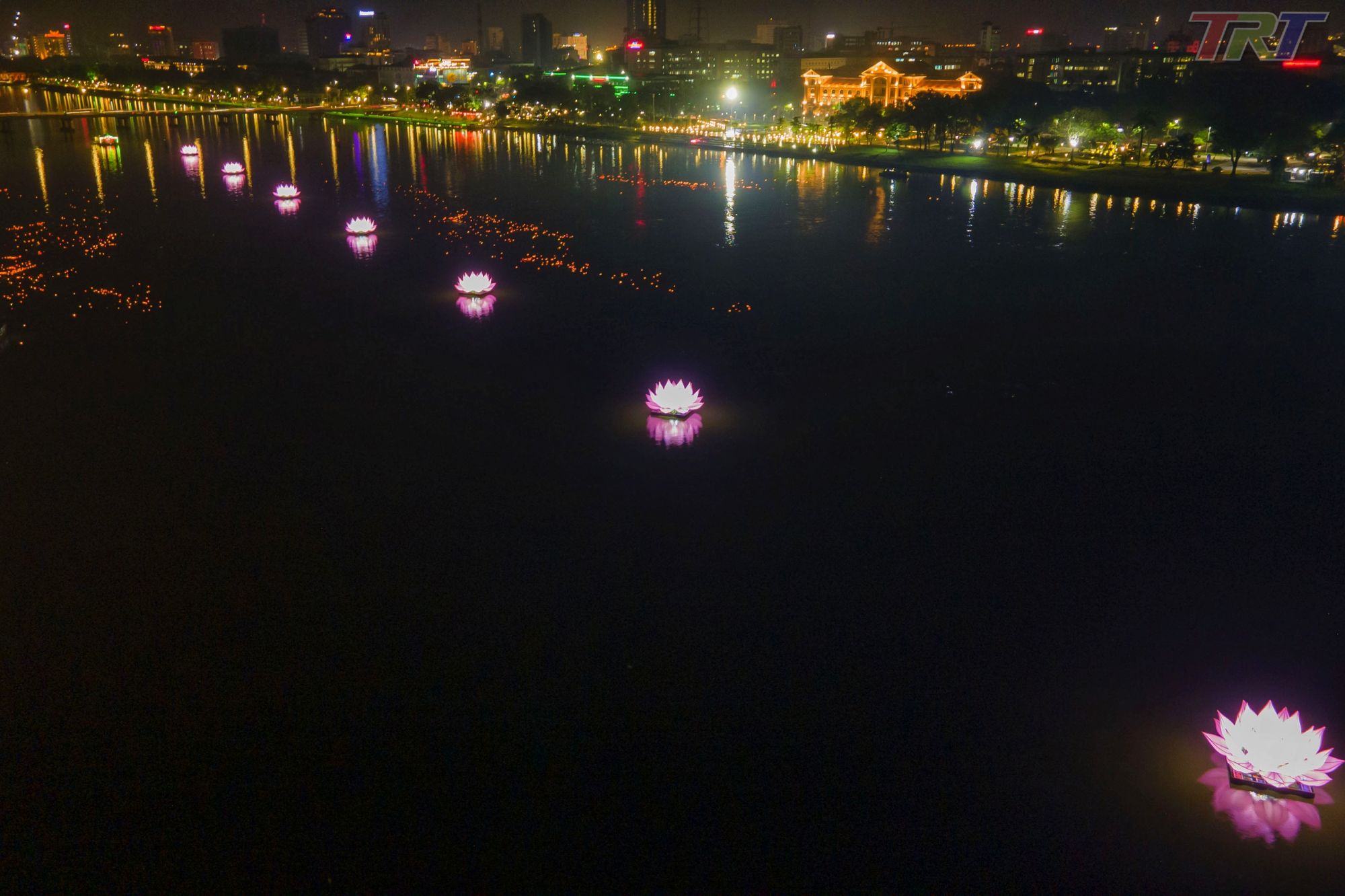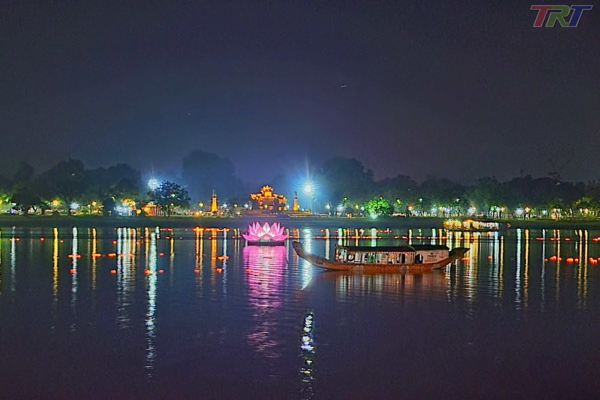 7 đoá hoa sen cùng hàng nghìn chiếc đèn hoa đăng làm cho sông Hương thêm lung linh, huyền ảo và thiêng liêng