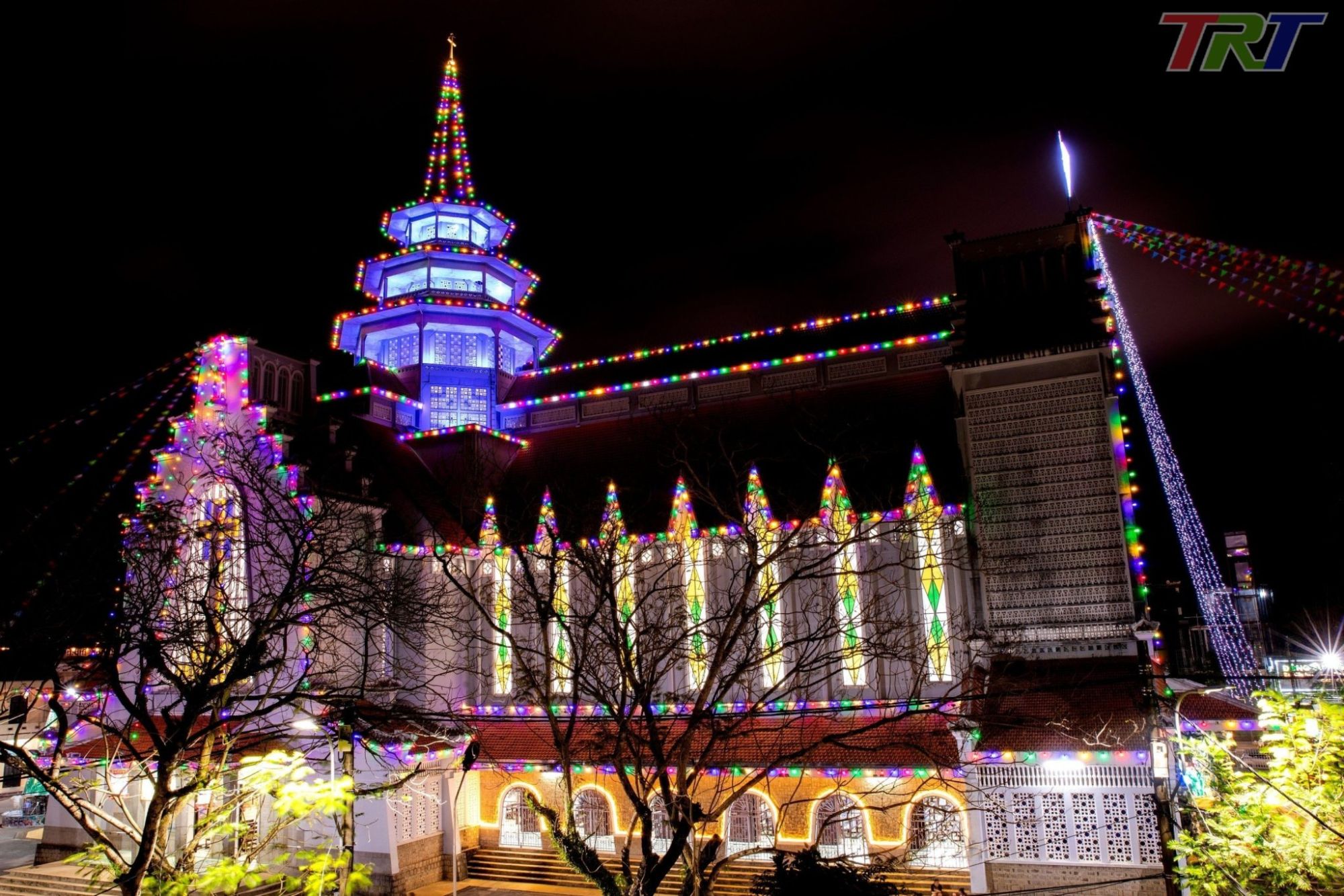 Nằm giữa hai con đường Nguyễn Huệ và Nguyễn Khuyến, nhà thờ Dòng Chúa Cứu Thế nổi bật với những chùm đèn nhiều màu sắc